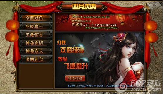 活动详情:活动期间玩家打怪挂机可获得双倍经验加成,此效果与VIP加成及经验卷轴不冲突,让您等级飞速提升。