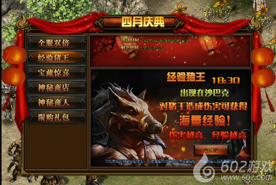 活动详情:经验猪王(沙巴克每日刷新经验猪王,对猪王造成伤害,根据对怪物造成的伤害计算经验值,伤害越高,经验越多)