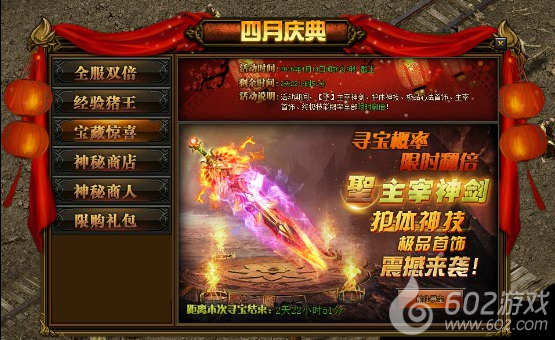 活动详情:活动期间寻宝几率翻倍,主宰神剑、主宰首饰、极品高转首饰、终极技能等你来拿,千万不要错过机会哦!