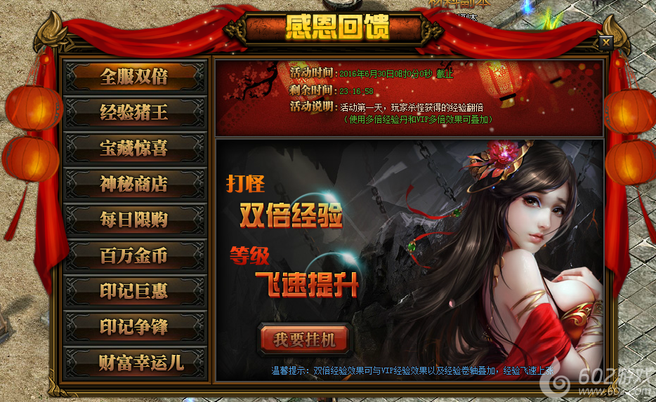 活动详情:动期间玩家打怪挂机可获得双倍经验加成,此效果与VIP加成及经验卷轴不冲突,让您等级飞速提升。