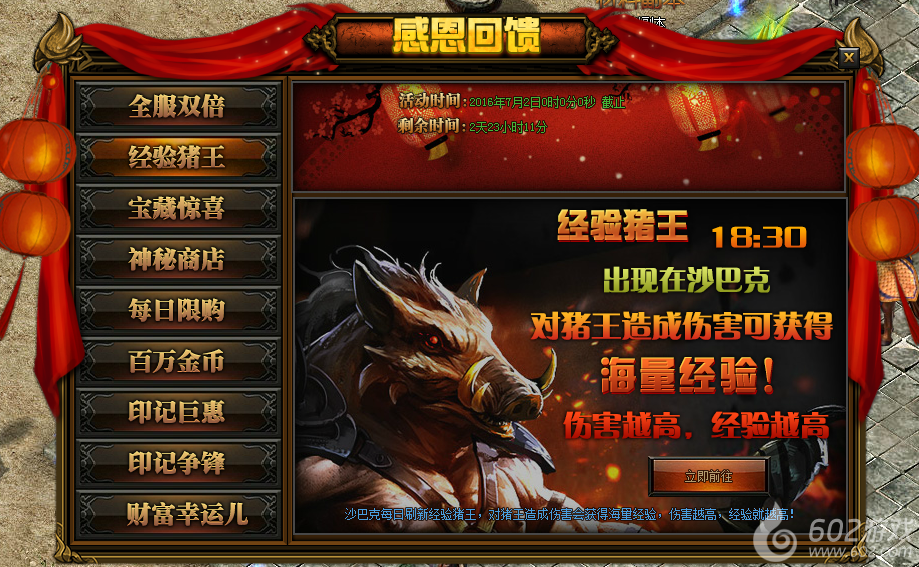活动详情:活动期间每日18:30沙巴克会刷出猪王,攻击猪王可以活动大量经验,伤害越高所获得的经验越多,小伙伴们不要错过哦~