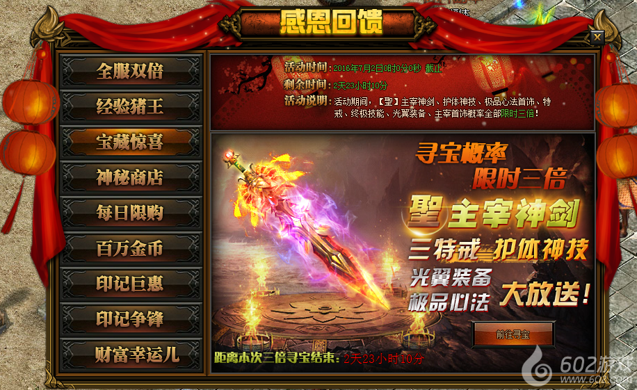 活动详情:活动期间寻宝概率大增,聖主宰神剑,护体神技,极品心法,光翼装备等你来拿~