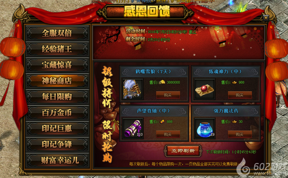活动详情:活动期间神秘商店内会推出极品道具并以超低的价格供玩家购买,宝石、坐骑、声望、金砖、荣誉、魂珠等你来抢,玩家可直接消耗元宝、金币、礼金进行购买,每样道具只能购买一次,当一页的物品购买完后,系统会自动免费刷新一次,您也可以消耗399元宝进行刷新。