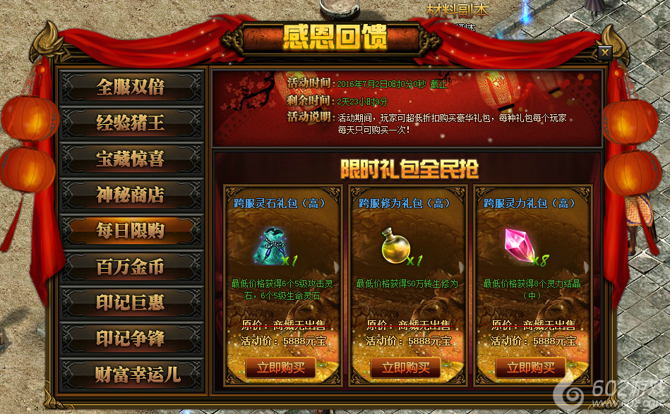 活动详情:活动期间系统会随机放出各种极品道具灵石礼包、高级超级修为、超级灵石、顶级神翼礼包等,礼包等级根据VIP划分,比如V3以下为一档,V4-V6为一档,v7以上为一档,每档所展示的礼包都不一样,且均会以极低的价格供大家购买,每样道具每人只能购买一次。