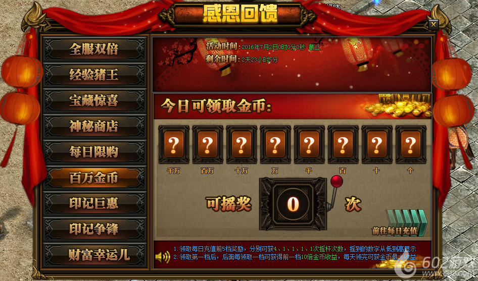活动详情:活动期间充值领取每日充值5档奖励,分别可获得4、1、1、1、1次摇杆次数,摇杆的次数会从低到高显示,每日充值的档次后面一档都会高出前面10倍金币收益,如果一天5档的领完就可获得当天金币的最大收益,获得的金币将在每日0点通过邮件的方式发送给玩家。