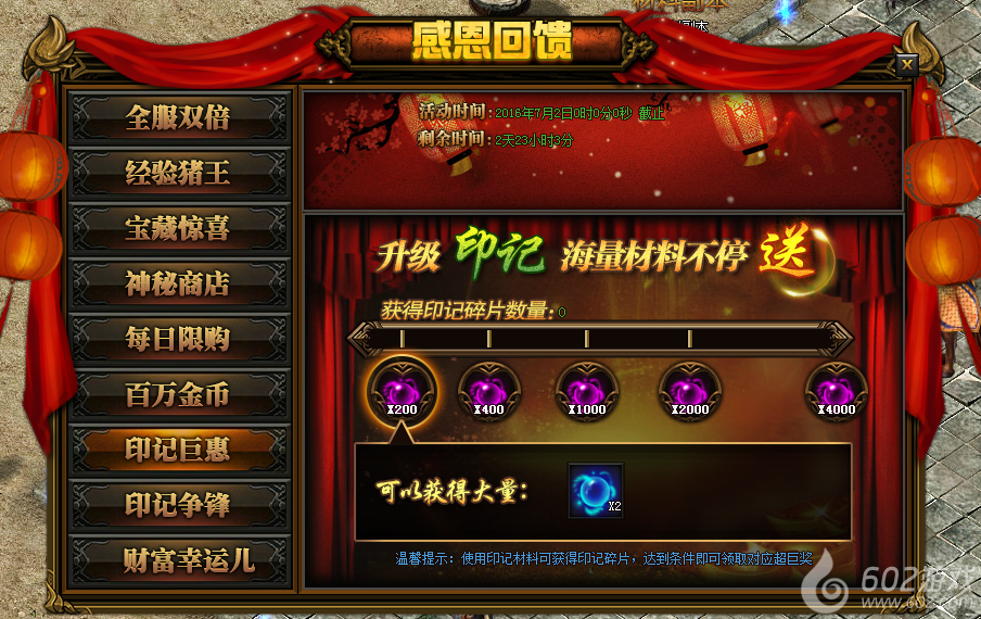 活动详情:活动期间玩家使用印记碎片,达到条件即可领取对应的奖励。