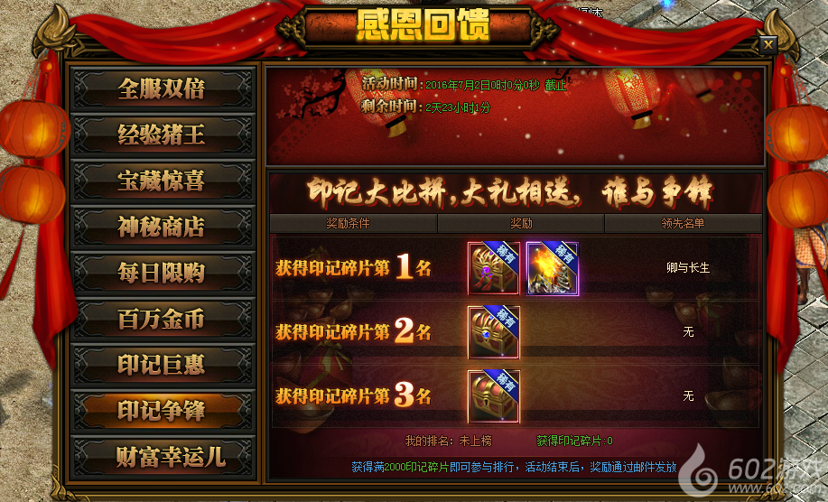 活动详情:活动期间玩家的印记碎片达到2000即可参与排行榜,活动结束后奖励会通过邮件的方式放