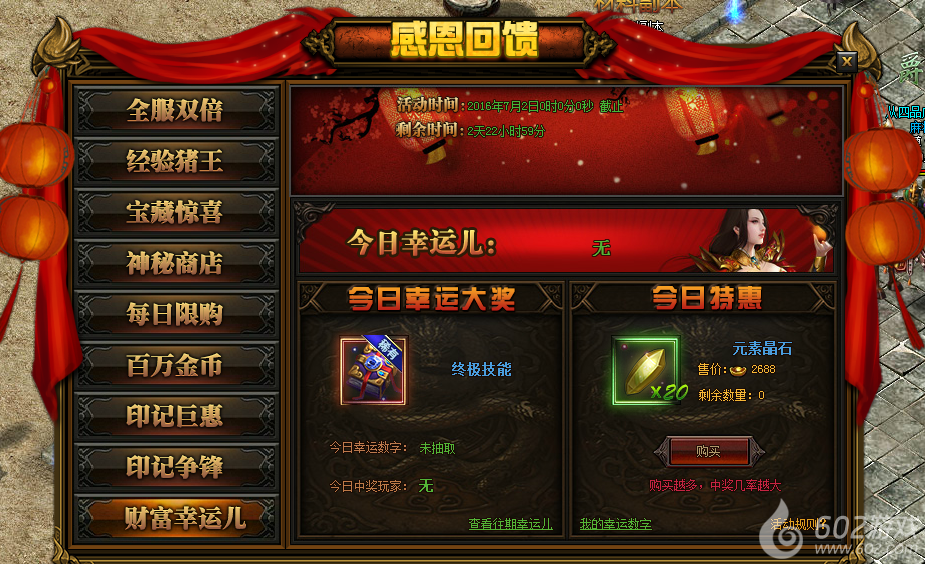 活动详情:活动期间每天0-21点可以购买特惠礼包,每服限量100个,购买特惠礼包可以获得1-100的幸运数字,数字不会重复,每天的21:00系统会随机抽取一个幸运数字,中奖的玩家将会获得该日的幸运大奖,奖品会通过邮件的方式发放给玩家。