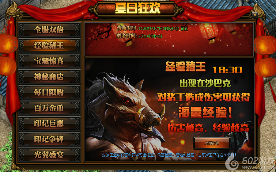 活动详情:活动期间每日18:30沙巴克会刷出猪王,攻击猪王可以活动大量经验,伤害越高所获得的经验越多,小伙伴们不要错过哦~