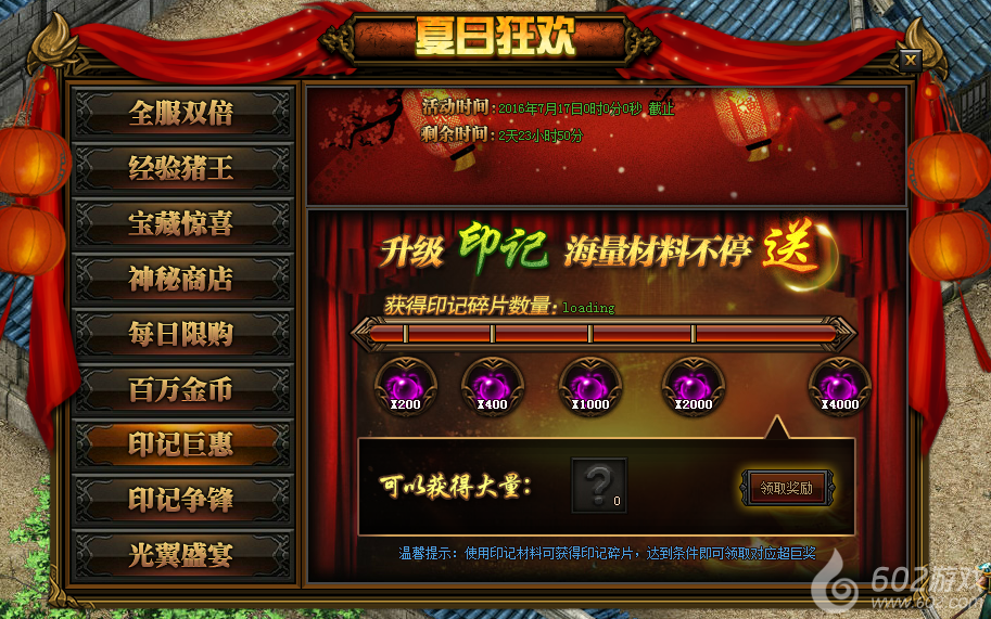 活动详情:活动期间玩家使用印记碎片,达到条件即可领取对应的奖励。