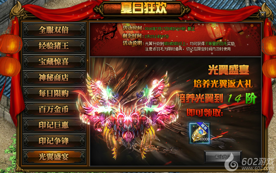 活动详情:培养光翼反大礼,活动期间玩家升级羽翼即可领取相应奖励
