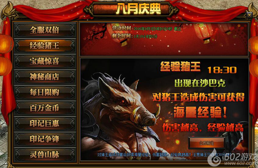 活动详情:活动期间每日18:30沙巴克会刷出猪王,攻击猪王可以活动大量经验,伤害越高所获得的经验越多,小伙伴们不要错过哦~