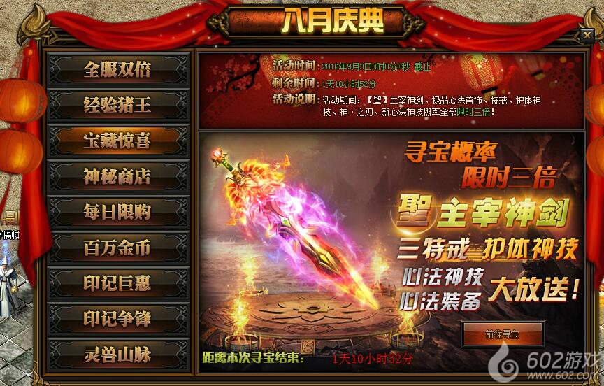 活动详情:活动期间寻宝概率大增,聖主宰神剑,护体神技,三大特戒、心法神装等你来拿~
