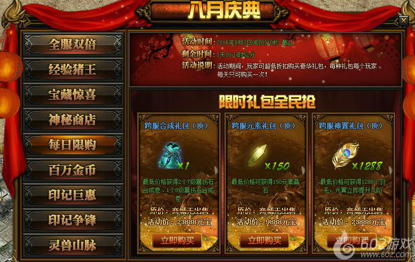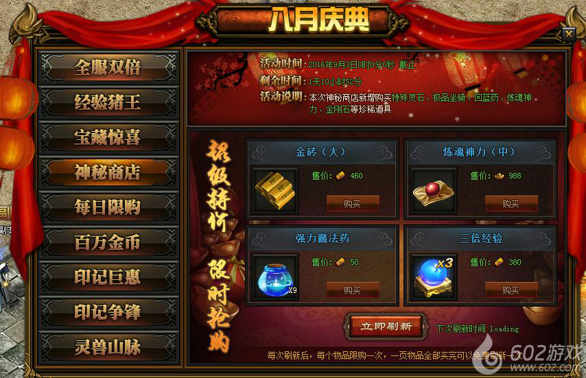 活动详情:活动期间神秘商店内会推出极品道具并以超低的价格供玩家购买,宝石、坐骑、声望、金砖、荣誉、魂珠等你来抢,玩家可直接消耗元宝、金币、礼金进行购买,每样道具只能购买一次,当一页的物品购买完后,系统会自动免费刷新一次,您也可以消耗399元宝进行刷新。
