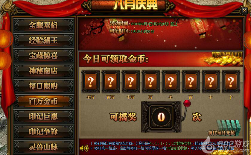活动详情:活动期间充值领取每日充值5档奖励,分别可获得4、1、1、1、1次摇杆次数,摇杆的次数会从低到高显示,每日充值的档次后面一档都会高出前面10倍金币收益,如果一天5档的领完就可获得当天金币的最大收益,获得的金币将在每日0点通过邮件的方式发送给玩家。