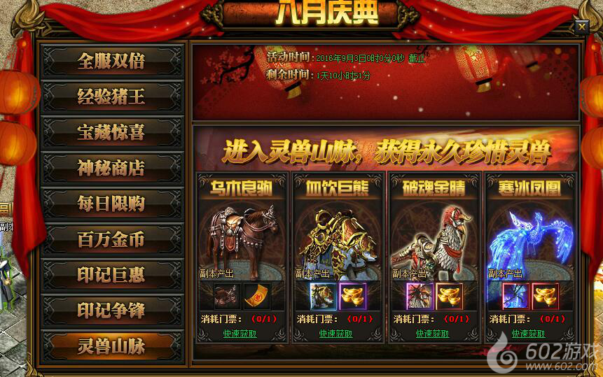 活动详情:活动期间玩家可购买灵兽山脉门票进入,击杀BOSS有几率掉落坐骑碎片和元宝