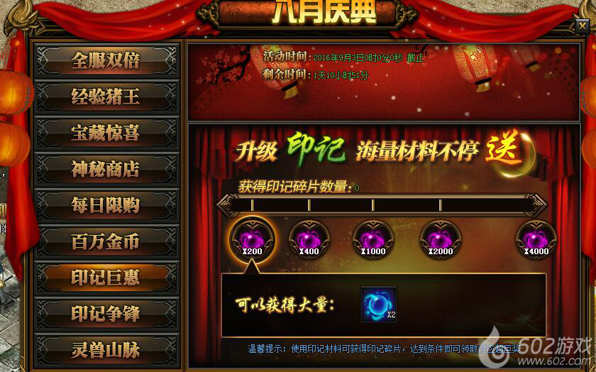 活动详情:活动期间玩家使用印记碎片,达到条件即可领取对应的奖励。