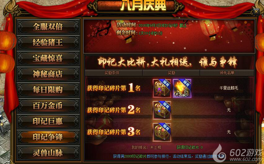 活动详情:活动期间玩家的印记碎片达到2000即可参与排行榜,活动结束后奖励会通过邮件的方式放