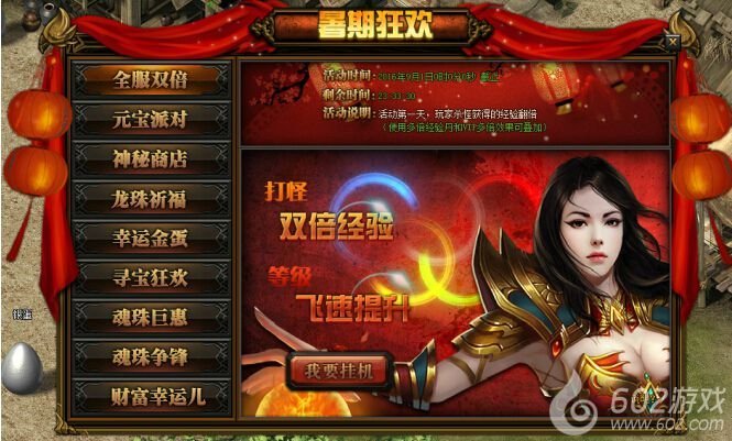 活动详情:活动期间玩家打怪挂机可获得双倍经验加成,此效果与VIP加成及经验卷轴不冲突,让您等级飞速提升。
