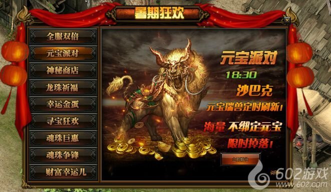 活动详情:活动期间每天18:30沙巴克会定时刷新元宝瑞兽,击杀BOSS掉落高级道具,更有几率掉落海量不绑定元宝~
