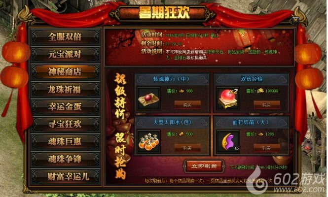 活动详情:活动期间神秘商店内会推出极品道具并以超低的价格供玩家购买,宝石、坐骑、声望、金砖、荣誉、魂珠等你来抢,玩家可直接消耗元宝、金币、礼金进行购买,每样道具只能购买一次,当一页的物品购买完后,系统会自动免费刷新一次,您也可以消耗399元宝进行刷新。