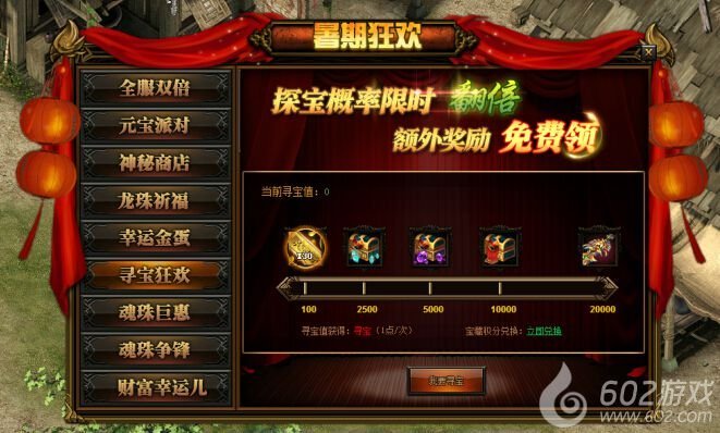 活动详情:活动期间内,寻宝概率翻倍。并可额外获得寻宝值。寻宝积分可兑换为寻宝值。达到每当额外领取大奖!