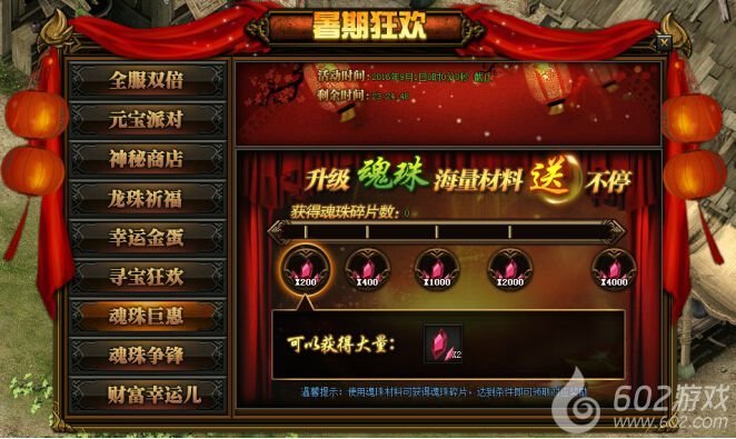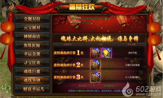 活动详情:活动期间玩家的魂珠碎片达到2000即可参与排行榜,活动结束后奖励会通过邮件的方式放给玩家。