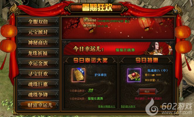 活动详情:活动期间玩家可在今日特惠里以优惠的价格购买相应的道具,每购买一次便可获得相应的一个幸运数字。系统会随机抽取一个幸运数字,每日21:00开奖,如果被系统抽到的幸运玩家就可获得今日幸运大奖,数量有限先到先得。