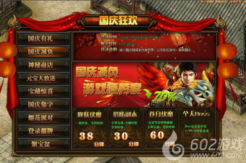 活动详情:活动期间玩家的降魔伏妖、个人BOSS、苍月附魔、塔防副本减负70%,让您轻松愉快过国庆~