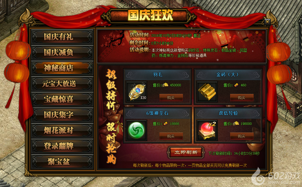 活动详情:活动期间神秘商店内会推出极品道具并以超低的价格供玩家购买,宝石、坐骑、声望、金砖、荣誉、魂珠等你来抢,玩家可直接消耗元宝、金币、礼金进行购买,每样道具只能购买一次,当一页的物品购买完后,系统会自动免费刷新一次,您也可以消耗399元宝进行刷新。