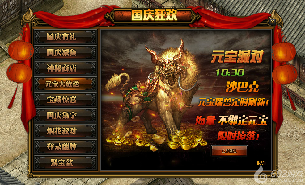 活动详情:活动期间每日18:30会在沙巴克刷新元宝瑞兽,玩家击杀可获得海量不绑定元宝哦~