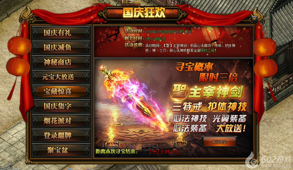 活动详情:活动期间玩家寻宝概率限时三倍,聖主宰神剑、特戒、护体神技、心法神技、光翼装备、心法装备等大放送哦~