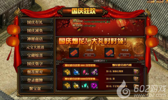 活动详情:活动期间玩家可购买烟花进行燃放,一烟花等于易积分哦~,达到对应的积分还可以领取奖励和参与排行,奖励丰厚,活动结束后奖励会通过邮件的方式发放给玩家~