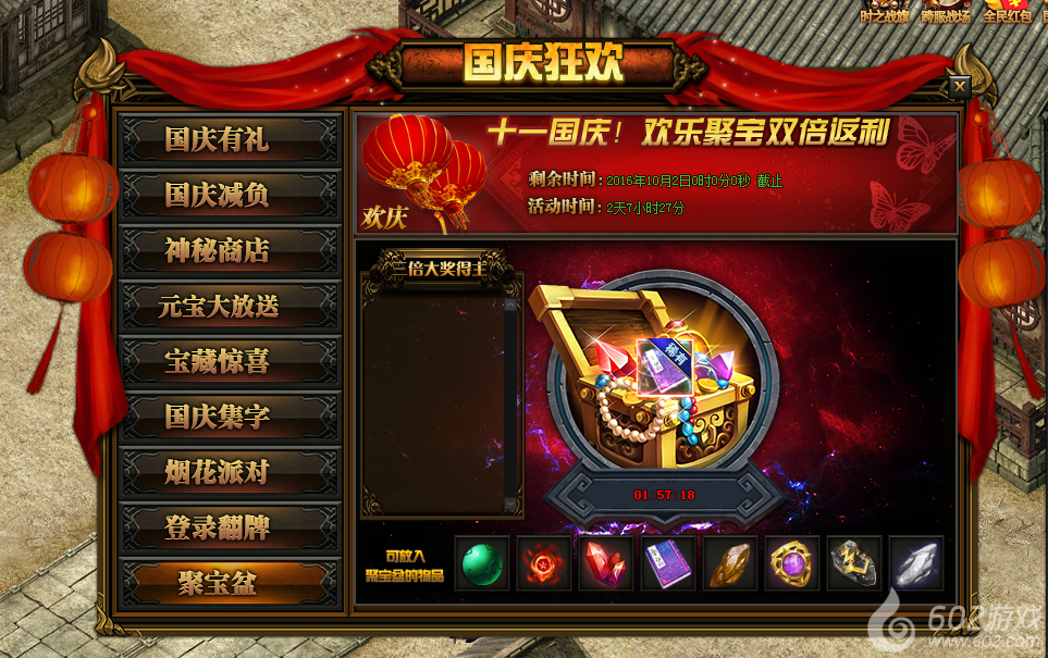 活动详情:双倍聚宝,双倍返利,活动期间,可以往聚宝盆放入指定道具,2小时后,可以收获双倍道具,更有一定几率收获3倍道具。投放需花费一定数量元宝。