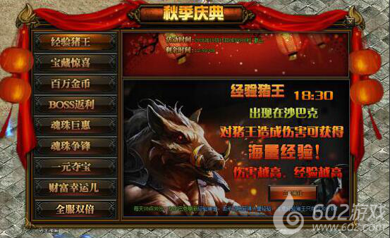 活动详情:活动期间每日18:30沙巴克会刷出猪王,攻击猪王可以活动大量经验,伤害越高所获得的经验越多,小伙伴们不要错过哦~