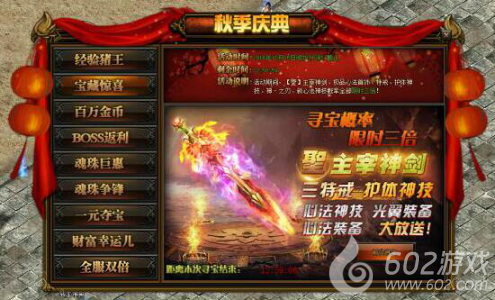活动详情:活动期间寻宝概率大增,聖主宰神剑,护体神技,极品心法,光翼装备,心法装备等你来拿~