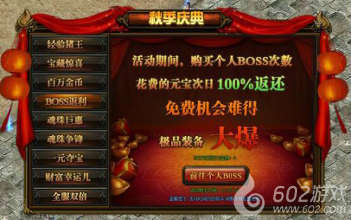 活动详情:活动期间购买个人BOSS所花费的元宝次日会已邮件的方式返还,相当于系统多送一次击杀BOSS的机会,小伙伴们不要错过哦~