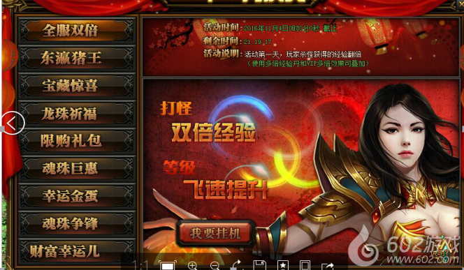 活动详情:活动期间玩家打怪挂机可获得双倍经验加成,此效果与VIP加成及经验卷轴不冲突,让您等级飞速提升。