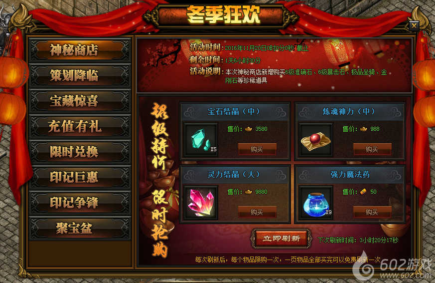 活动详情:活动期间神秘商店内会推出极品道具并以超低的价格供玩家购买,本次新增6级准确石、6级暴击石、极品坐骑、金刚石等珍惜道具,玩家可直接消耗元宝、金币、礼金进行购买,每样道具只能购买一次,当一页的物品购买完后,系统会自动免费刷新一次,您也可以消耗399元宝进行刷新