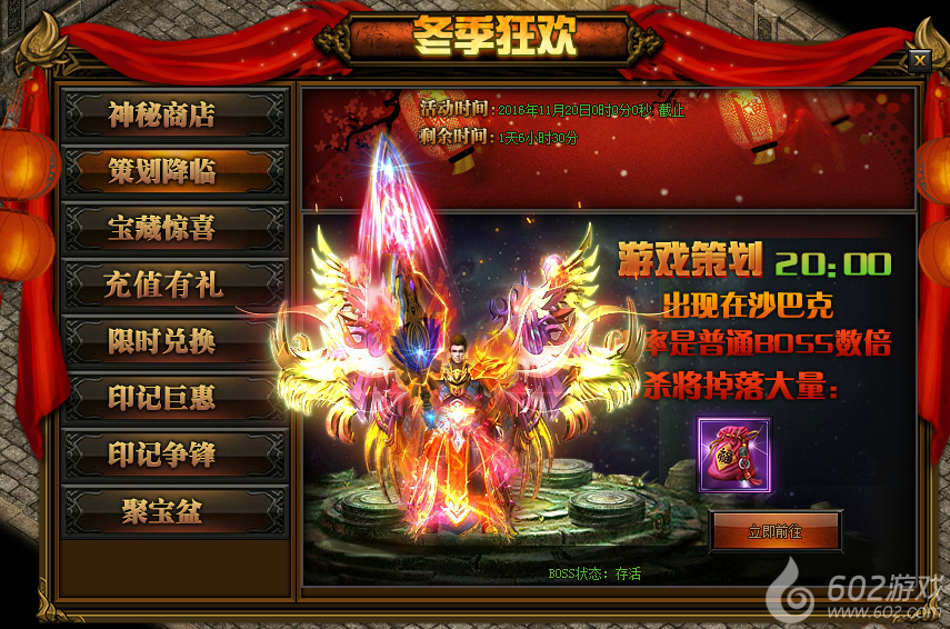 活动详情:活动期间游戏策划每日20点出现在沙巴克,爆率是普通BOSS数倍,击杀将掉落大量的福袋,击杀策划势在必行~