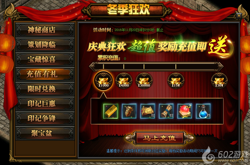 活动详情:活动期间超值奖励充值即送,达到条件即可领取对应奖励,每档只可领取一次