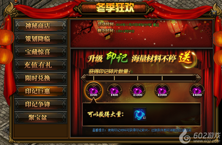 活动详情:活动期间升级印记海量材料送不停,心动不如行动。(温馨提示:使用印记材料可获得印记碎片,达到条件即可领取对应奖励)