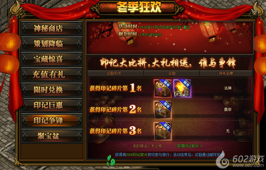 活动详情:活动期间印记大比拼,大礼相送,谁与争锋;满2000印记碎片即可参与排名,活动结束后,奖励通过邮件发放。