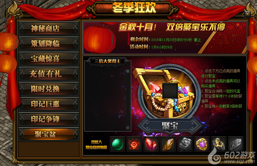 活动详情:活动期间点击未点亮的道具可以购买道具,点击已点亮的道具进行聚宝,聚宝有一定概率3倍收获