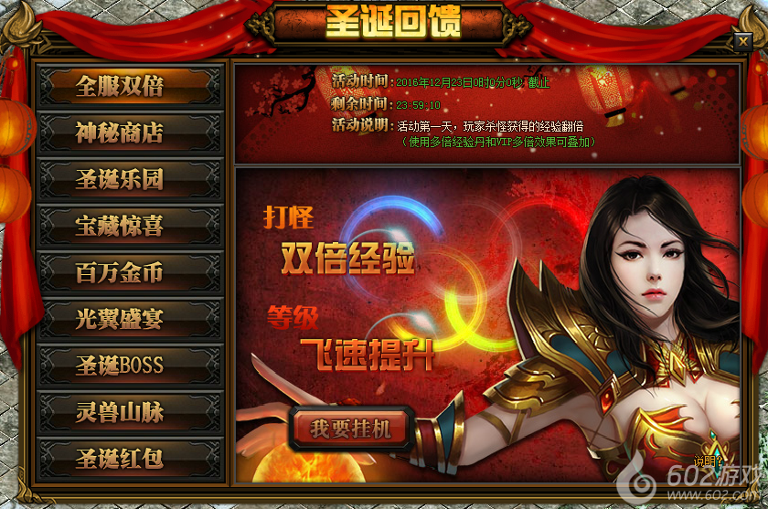 活动详情:活动期间玩家打怪挂机可获得双倍经验加成,此效果与VIP加成及经验卷轴不冲突,让您等级飞速提升。