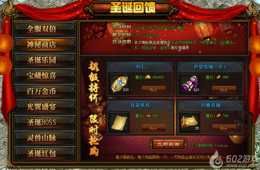 活动详情:活动期间神秘商店内会推出极品道具并以超低的价格供玩家购买,本次新增圣诞节绝版称号、6级准确石、6级暴击石、极品坐骑、金刚石等珍惜道具,玩家可直接消耗元宝、金币、礼金进行购买,每样道具只能购买一次,当一页的物品购买完后,系统会自动免费刷新一次,您也可以消耗399元宝进行刷新