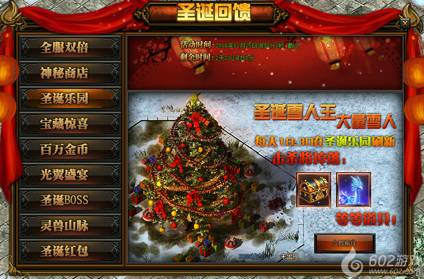 活动详情:活动期间每日18:30在圣诞乐园刷新圣诞雪人王和大量雪人,击杀将掉落圣诞宝箱、神秘坐骑等道具,机会不容错过~