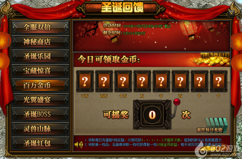 活动详情:活动期间领取每日充值5档奖励,分别可获得4、1、1、1、1次摇杆次数,摇杆的字数会从低到高显示,每日充值的档次后面一档都会高出前面10倍金币收益,如果一天5档的领完就可获得当天金币的最大收益,获得的金币将在每日0点通过邮件的方式发送给玩家