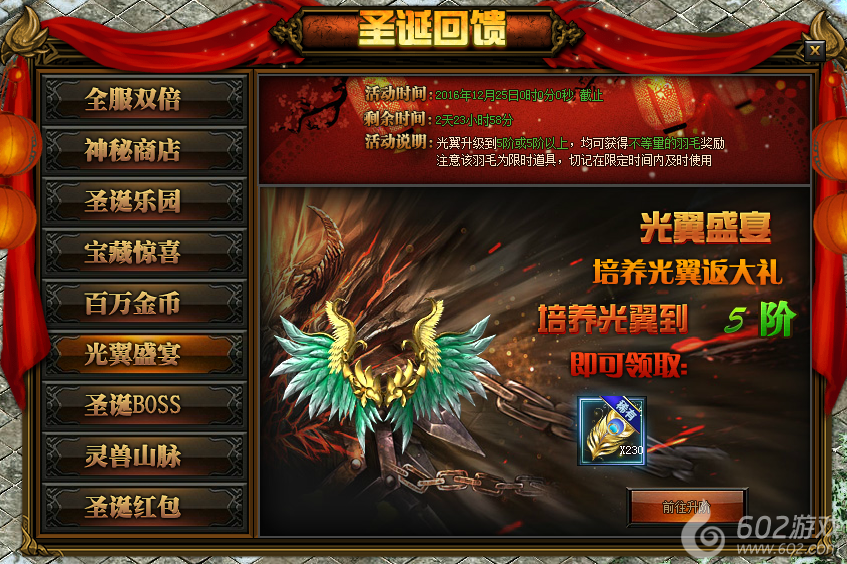 活动详情:活动期间培养光翼到5阶及以上,即可领取不等量的羽毛奖励,奖励不容错过~