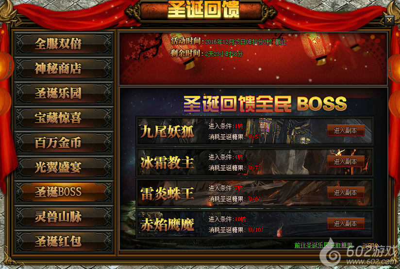 活动详情:活动期间玩家可在圣诞乐园击杀雪人、麋鹿掉落圣诞糖果,玩家获得圣诞糖果后可消耗相应糖果进入副本,副本要求等级为1转、4转、7转、10转、对应消耗的糖果为5个、7个、8个、10个。BOSS会随机爆出2、4、6、8转装备不等